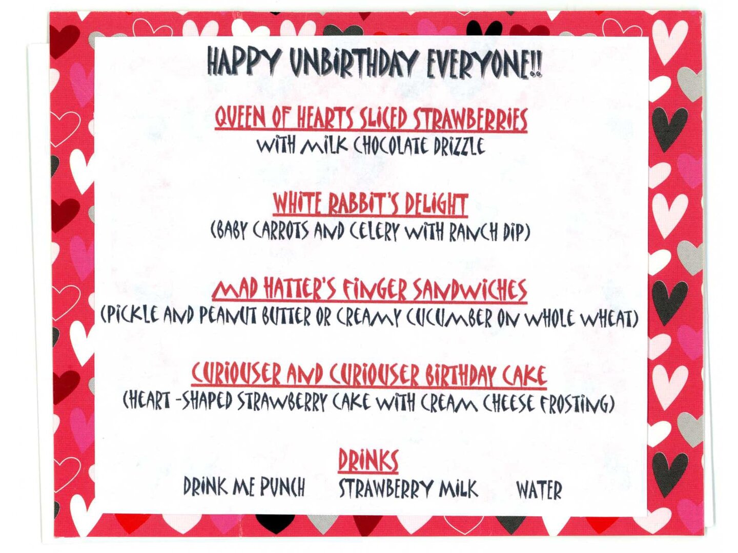Menu is to be at least 4 x 6 inches or larger in your choice of medium; printed, typed, etc. You may decorate and/or prop up the menu. Be creative and imaginative.